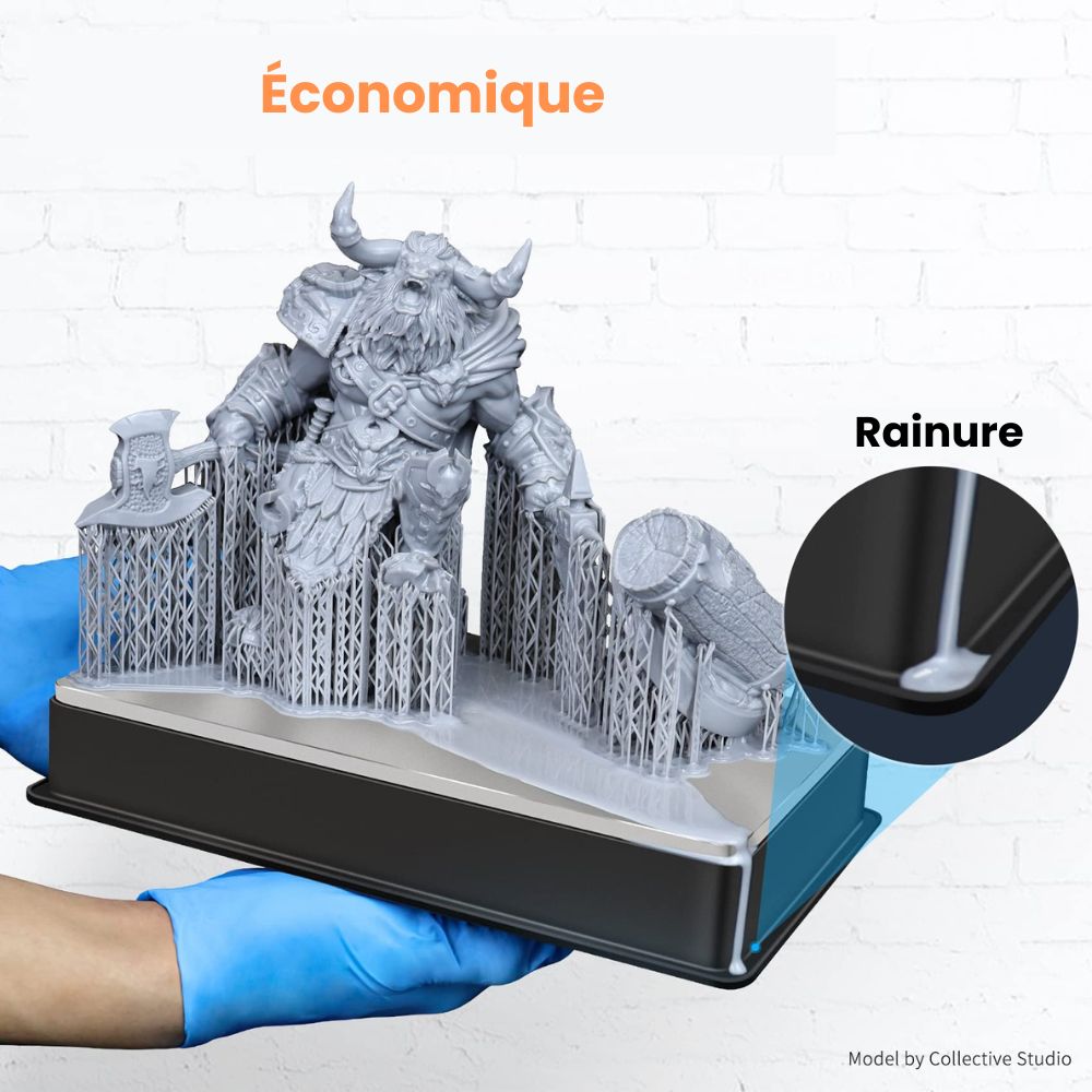 Des rainures sur le tour du plateau permettent de recueillir la résine lorsque vous retournez le plateau afin d'éviter les coulures sur le sol ou la surface de travail. Il est simple à nettoyer.